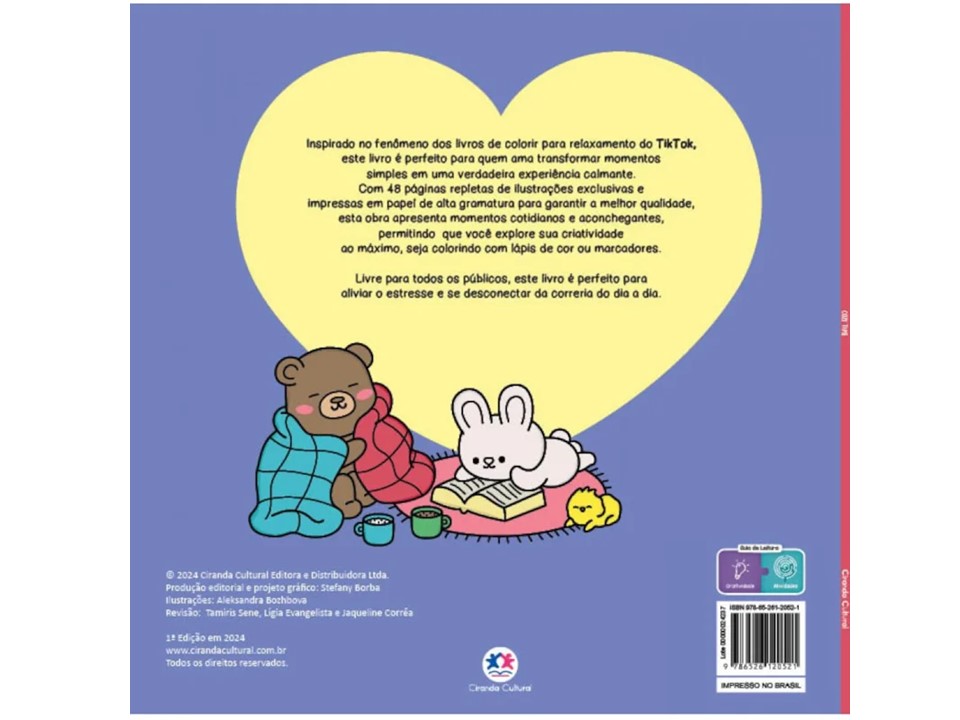 Inspirado no fenômeno dos livros de colorir para relaxamento do TikTok, o livro Cozy time é perfeito para quem ama transformar momentos simples em uma verdadeira experiência calmante. Impressas em papel de alta gramatura, para garantir a melhor qualidade de pintura, as 48 páginas com 24 ilustrações exclusivas retratam momentos cotidianos e aconchegantes, permitindo que você explore sua criatividade ao máximo, seja colorindo com lápis de cor ou marcadores. Livre para todos os públicos, este livro é perfeito para aliviar o estresse e se desconectar da correria do dia a dia.